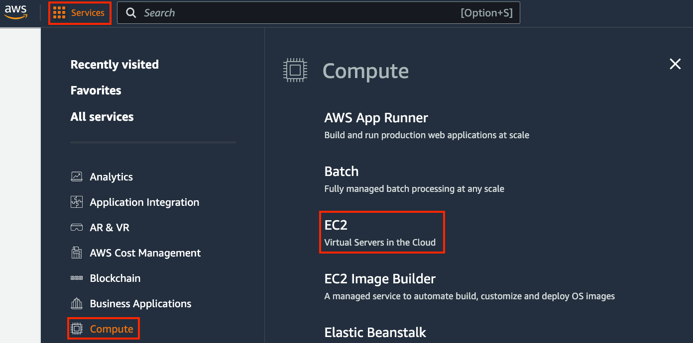 AWS アカウントにログインしたら、“EC2” をクリックして (図 23.3.1) EC2 パネルへ移動する。