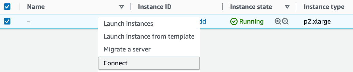 このインスタンスをさらに多くのインスタンスのテンプレートとして使いたい場合は、 図 23.3.9 の例を右クリックして “Image” \(\rightarrow\) “Create” を選び、インスタンスのイメージを作成する。完了したら、“Instance State” \(\rightarrow\) “Terminate” を選んでインスタンスを終了する。次回このインスタンスを使いたいときは、この節の手順に従って保存したイメージを基にインスタンスを作成できる。違いは、 図 23.3.4 に示した “1. Choose AMI” で、左側の “My AMIs” オプションを使って保存したイメージを選択する点だけである。作成されたインスタンスには、イメージのハードディスクに保存されていた情報が保持される。たとえば、CUDA やその他の実行環境を再インストールする必要はない。