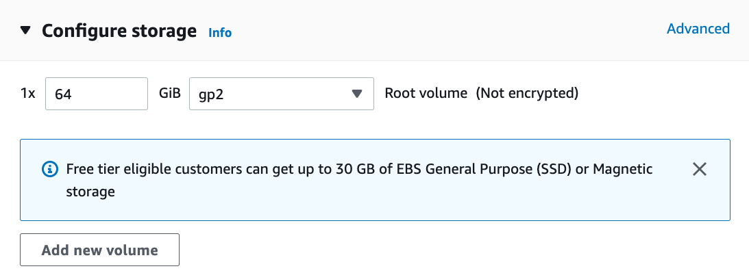この例では、“Network settings” の既定設定はそのままにする(サブネットやセキュリティグループなどを設定するには “Edit” ボタンをクリックする)。ここでは、既定のハードディスクサイズを 64 GB に増やすだけにする (図 23.3.7)。CUDA だけでもすでに 4 GB を占有することに注意する。