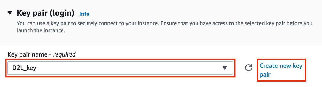 続いて、インスタンスにアクセスするためのキーペアを選択する。キーペアがない場合は、 図 23.3.6 の “Create new key pair” をクリックしてキーペアを生成する。その後、以前に生成したキーペアを選択できる。新しいキーペアを生成した場合は、必ずダウンロードして安全な場所に保管する。これはサーバーへ SSH 接続する唯一の方法である。