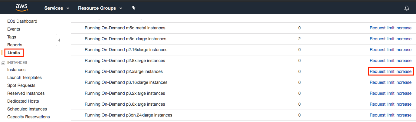 インスタンスを選ぶ前に、左側のバーにある “Limits” ラベルをクリックして、数量制限があるかどうかを確認する。 図 23.3.2 に示すようにする。 図 23.3.3 はそのような制限の例である。現在のアカウントでは、リージョンの制約により “p2.xlarge” インスタンスを起動できない。1 つ以上のインスタンスを起動する必要がある場合は、“Request limit increase” リンクをクリックして、より高いインスタンス割り当てを申請する。通常、申請の処理には 1 営業日かかる。