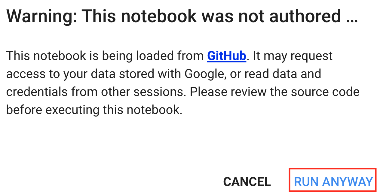 コードセルを初めて実行する場合は、 図 23.4.2 に示すような警告メッセージが表示される。 それを無視するには、“RUN ANYWAY” をクリックする。