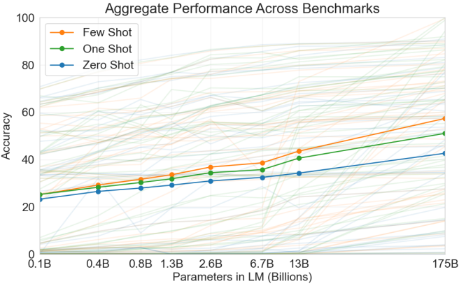 図 11.9.8 GPT-3 の全 42 個の精度指標ベンチマークにおける集計性能(キャプションを調整し、図は Brown et al. (2020) より)。¶