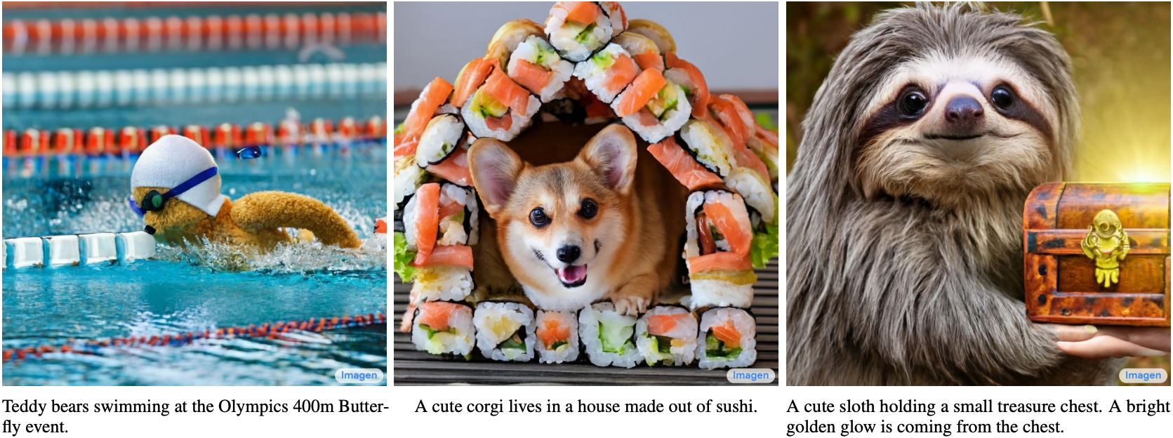 ファインチューニング後、110 億パラメータの T5(T5-11B)は、 複数のエンコーディング(たとえば分類)および生成(たとえば要約)ベンチマークで最先端の結果を達成した。 公開以来、T5 は後続研究で広く利用されている。 たとえば、Switch Transformer は T5 を基に設計され、 パラメータの一部のみを活性化して 計算効率を高めている (Fedus et al., 2022)。 Imagen と呼ばれる text-to-image モデルでは、 テキストは 46 億パラメータを持つ凍結された T5 エンコーダ(T5-XXL)に入力される (Saharia et al., 2022)。 図 11.9.5 の写実的な text-to-image 例は、 T5 エンコーダ単体でも、ファインチューニングなしで テキストを効果的に表現できる可能性を示唆している。