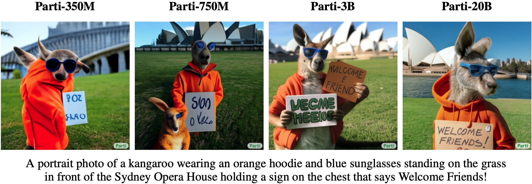 図 11.9.12 同じテキストから生成された、サイズが増加する Parti モデル(350M、750M、3B、20B)による画像例(例は Yu et al. (2022) より)。¶