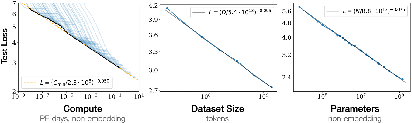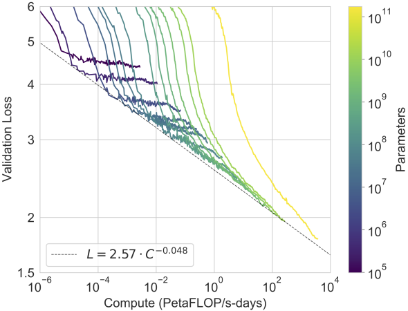 図 11.9.10 Transformer 言語モデルの学習ラン(図は Kaplan et al. (2020) より)。¶
